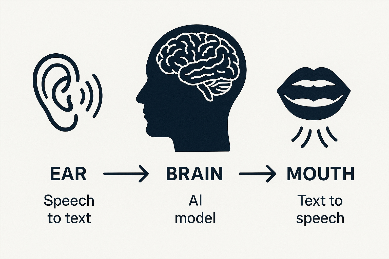 Think of AI voice agents as having three main parts working together and processing information just as a human will. First, you have the ear that converts your spoken words into text. This is very similar to how a human customer support agent will process information by first listening. For an AI voice agent, this process also happen instantly as you speak.