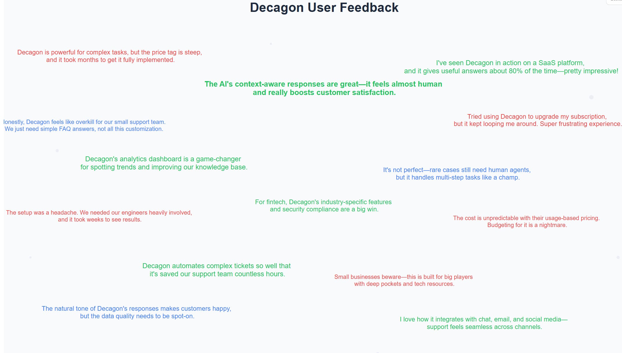 Decagon is built for big companies with complex needs. Users like its analytics and smart responses, but it comes with months of setup, requires technical teams to implement, and costs way more than most small businesses can afford.