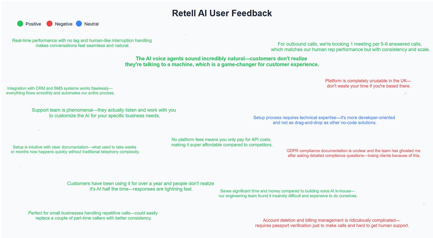 While this sounds very compelling, this week I went down the Reddit rabbit for customer sentiment so I can help you separate the hype from the reality. I reviewed Reddit comments for two popular B2B voice agents, Retell AI and Decagon.