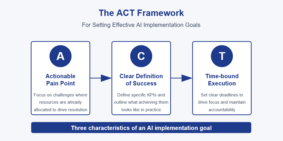 The first pillar of the ACT framework is ensuring that the goal addresses an actionable pain point. This principle was evident in Kennedy’s moonshot. The pain point—America’s lag in space exploration—was clear, but what made it actionable was Kennedy’s commitment to mobilizing resources and launching a tangible project - the Apollo Program. Similarly, in business, not all pain points warrant AI intervention. Business owners must focus on challenges where labor and capital resources have already been allocated to drive a resolution.